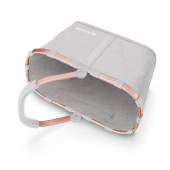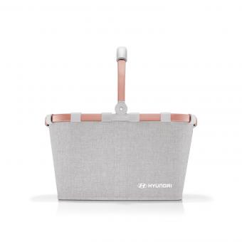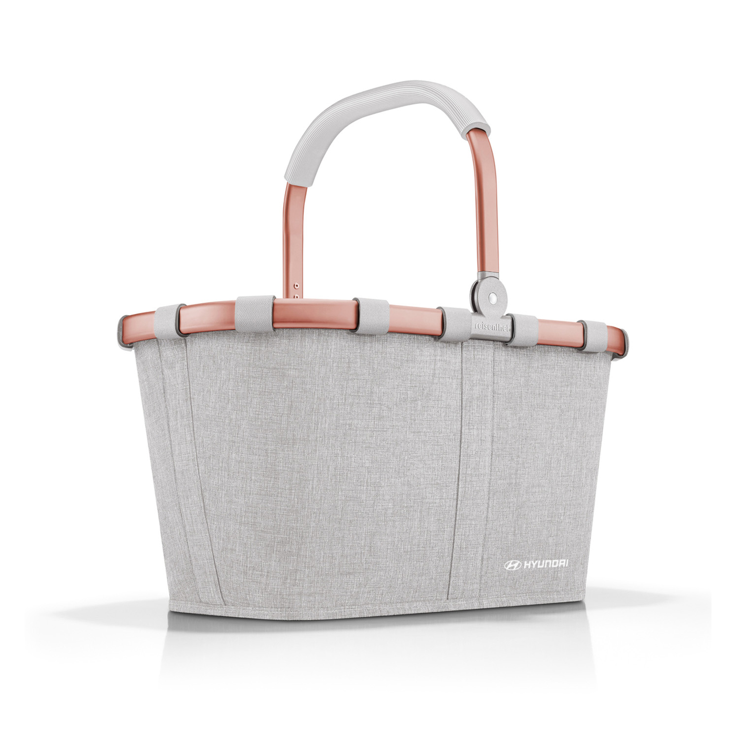 Der graue Stoff des Korbs webt sich elegant um das roségoldene Metallgestell und wird durch das weiße Hyundai Logo in der Ecke vollendet.