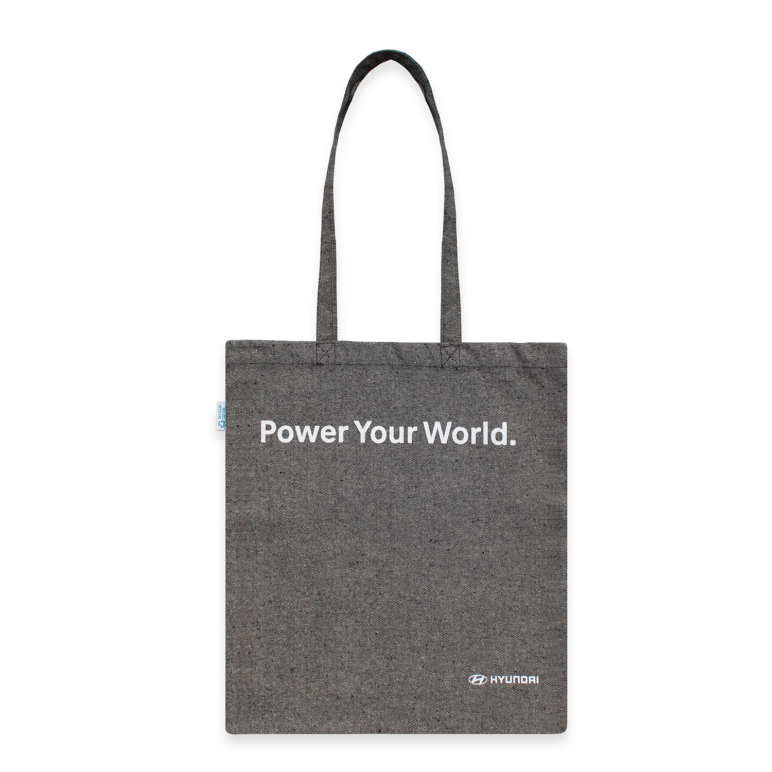 Die nachhaltige Hyundai Tragetasche besteht aus recycelter Baumwolle und setzt auch optisch einige Akzente: Das „Power Your World“-Motto auf dem stilvollen Grauton, wird durch das Hyundai Logo an der unteren Ecke ergänzt.