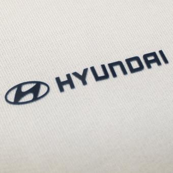 dem sandfarbenen Baumwollstoff. Auf der Vorderseite hebt sich das blaue Hyundai
