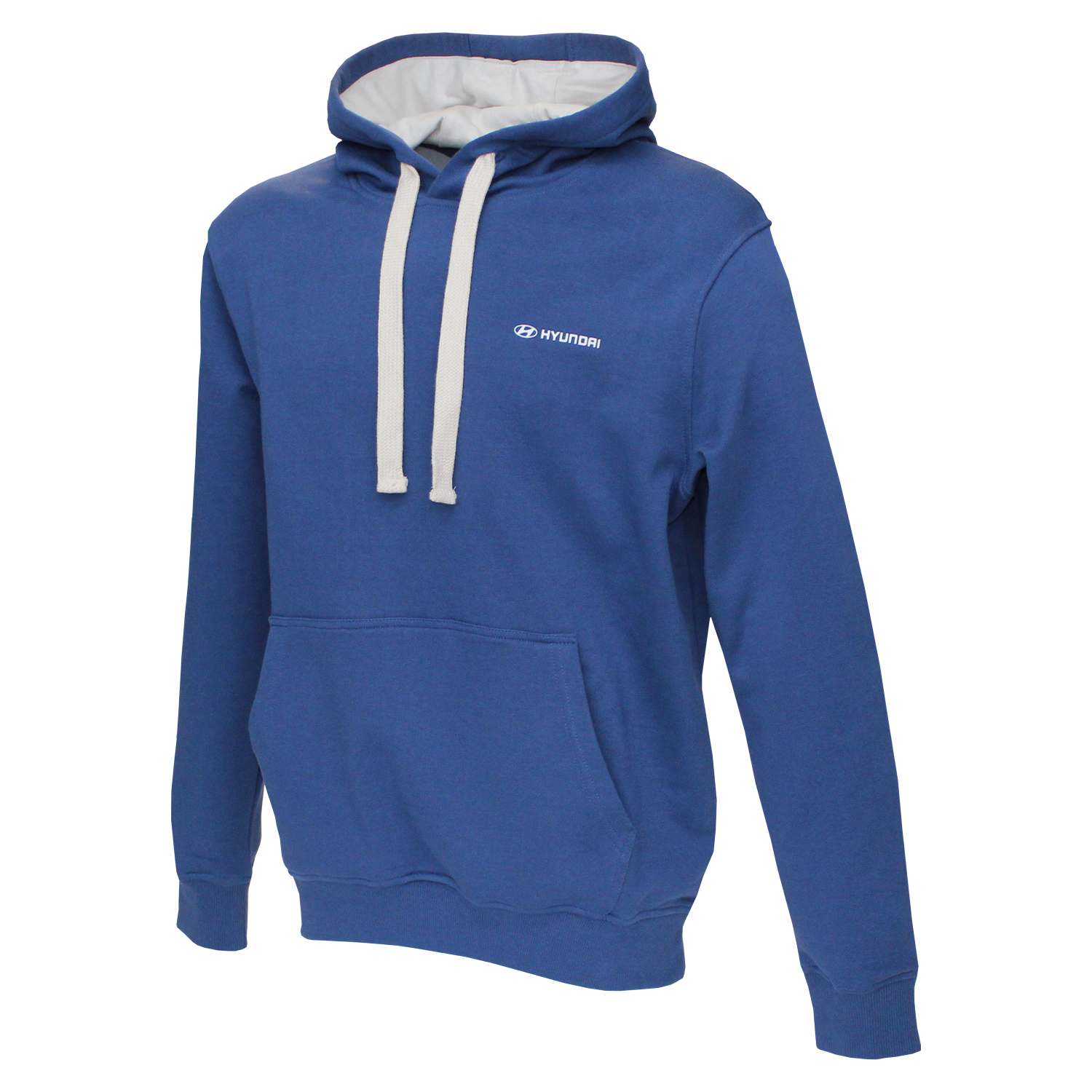 Der blaue Hyundai Hoodie setzt seine stilvollen Akzente mit der Kapuzeninnenseite und den Kordeln in Kontrastfarbe. Er verfügt über eine typische Känguru-Tasche. Vollendet wird die markante Farbgebung durch das weiße Hyundai Logo auf der Vorderseite, das durch seinen 3D-Druck wortwörtlich hervorsticht.