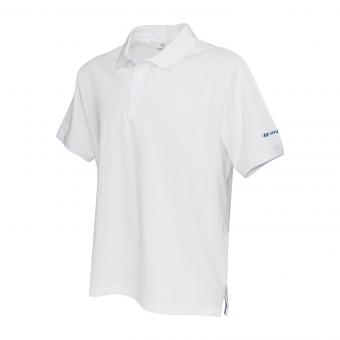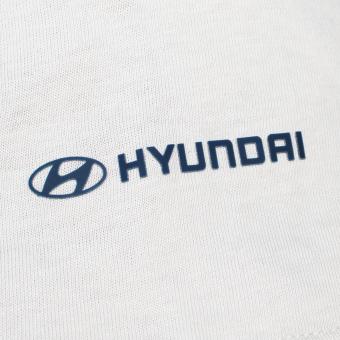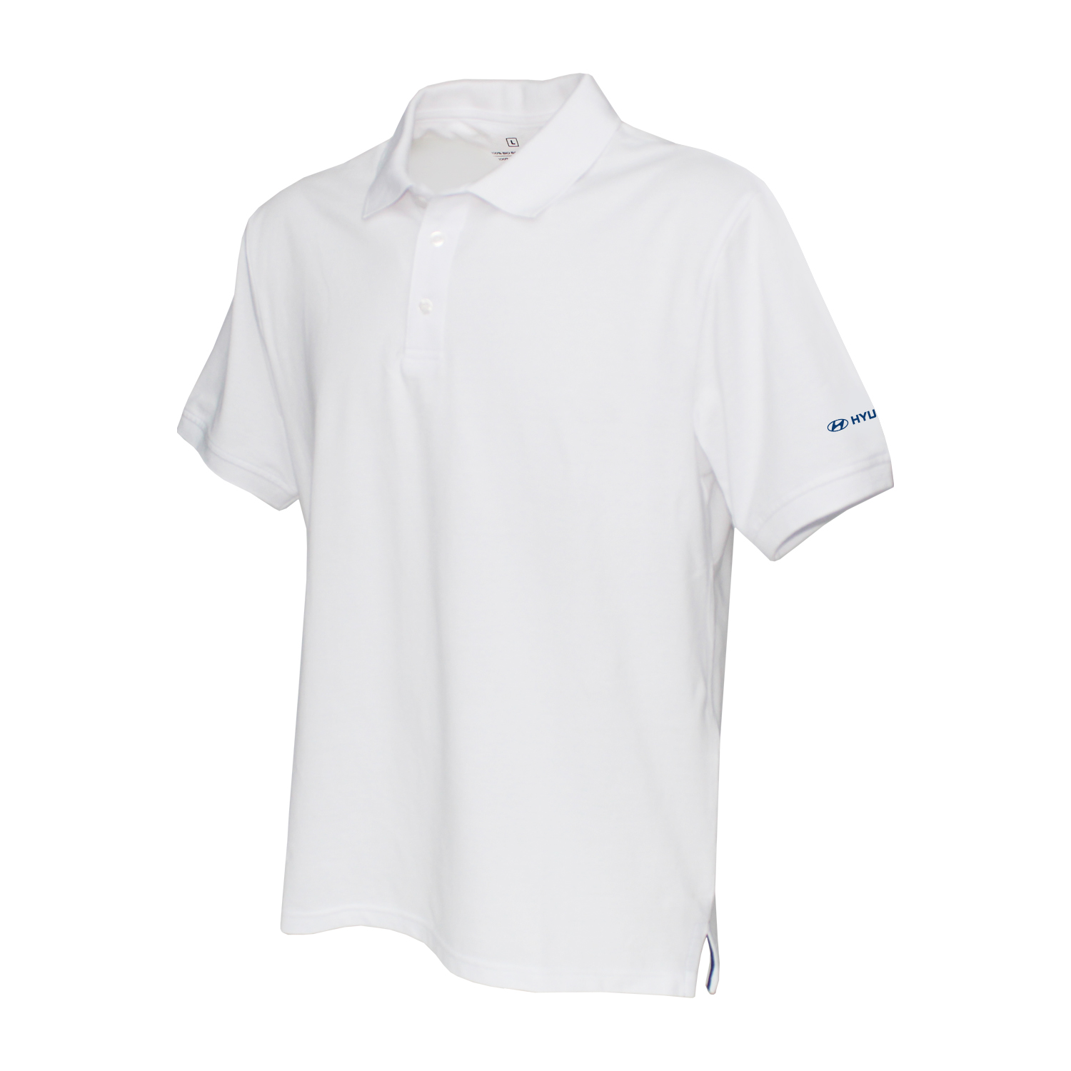 weiße Poloshirt mit dunkelblauem Hyundai Logo auf dem Oberarm setzt einen
