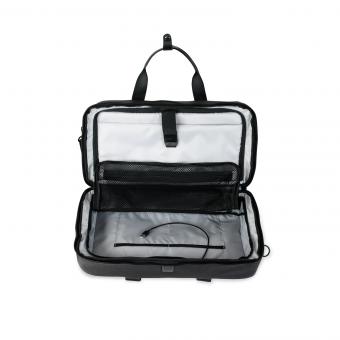 Das Hauptfach lässt sich vollständig öffnen, wodurch alle Gegenstände ihren Platz finden. An der Oberseite lassen sich die beiden Tragegriffe mit Lederapplikationen durch eine hochwertige Schnalle zu einem Griff verbinden. Für lange Reisen verfügt die Oberseite eine praktische Öffnung zum Herausführen von Kabeln, der Reißverschlusszipper mit geprägtem Hyundai Logo ist aus hochwertigem Metall gefertigt– rundum durchdachte Details, die diese Tasche zu einem echten Allrounder machen. In Kombination mit dem Hyundai Business Rucksack sind Sie somit platztechnisch bestens für Ihre Reise versorgt.